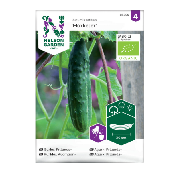 Økologiske frø. 'Marketer' er en frisk og hardfør agurksort som gir en rikelig avling av lange, mørkegrønne frukter med lett ruglete skall. Perfekt å nyte fersk, rett fra planten! Denne sorten er ideell for utendørs dyrking på en solrik plass og gir smakfulle, sprø agurker hele sommeren.