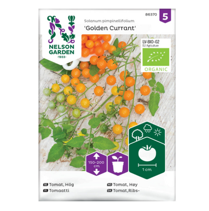 Økologiske frø. 'Golden Currant' er en liten druetomat som produserer en rikelig avling av søte, guloransje tomater. Perfekte som snacks rett fra planten! Tomatene kan høstes fortløpende gjennom sesongen. I motsetning til mange andre tomatsorter, skal sideskuddene i bladvikene, også kalt "tyver", ikke fjernes.